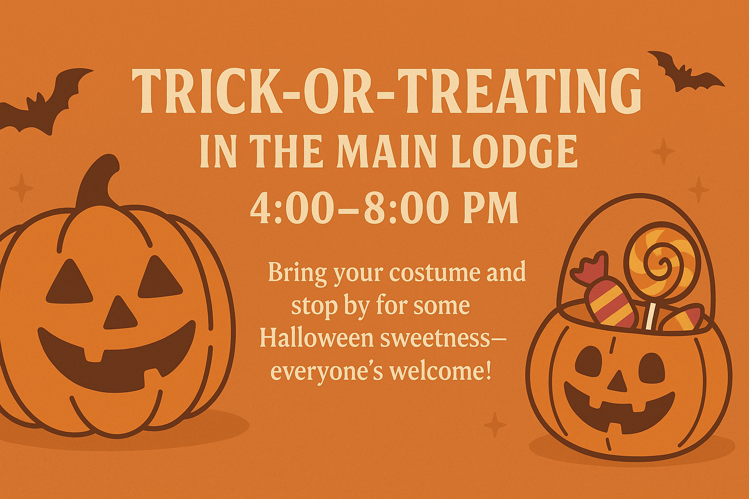 Join us in the Main Lodge for Trick-or-Treating from 4:00–8:00 PM! Stop by in costume and collect some sweet treats, fun for all ages.